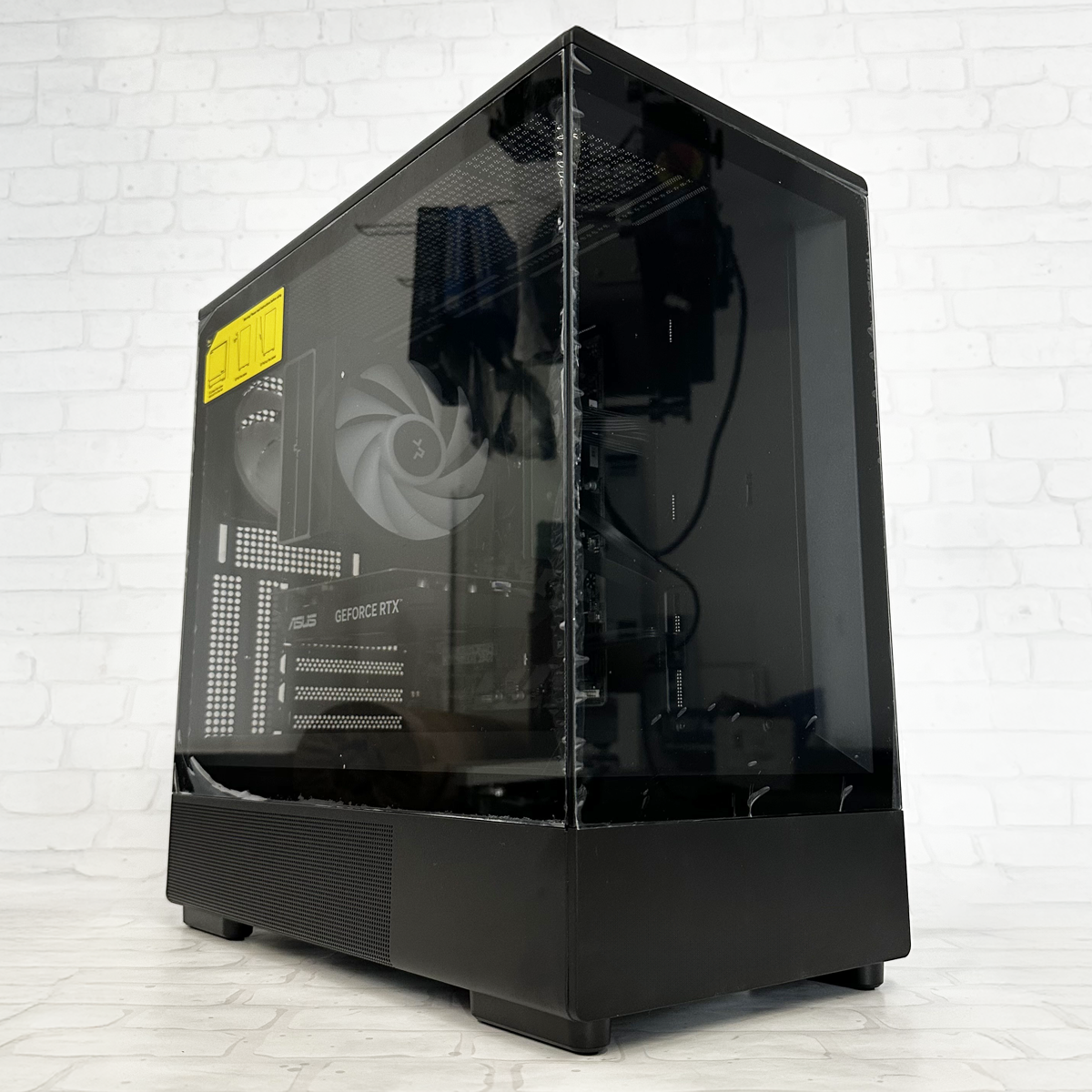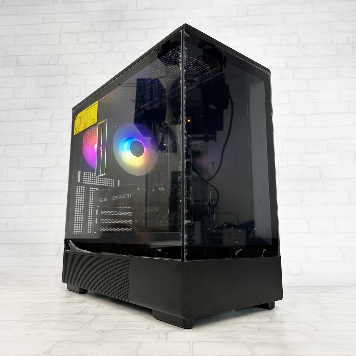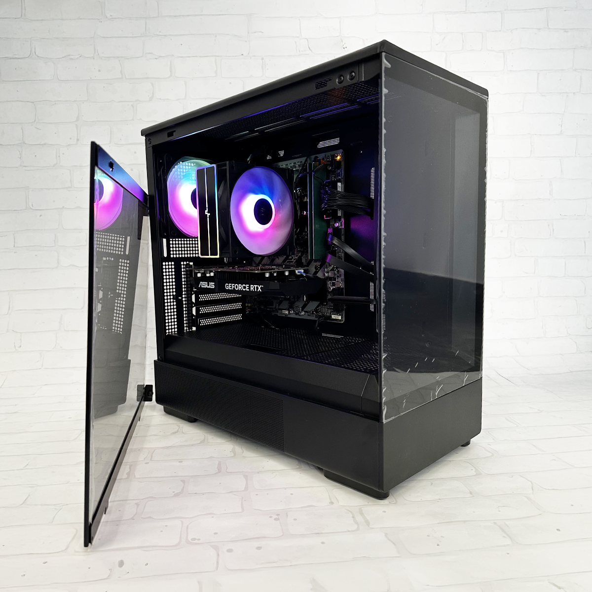 Carcasa gaming din imagine are un design modern, cu panou lateral din sticlă securizată și iluminare RGB, iar sistemul de răcire este optimizat pentru airflow eficient, menținând temperaturi scăzute chiar și în utilizare intensă.